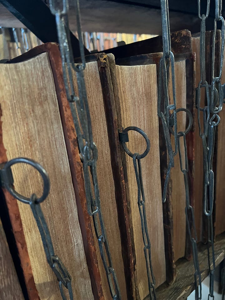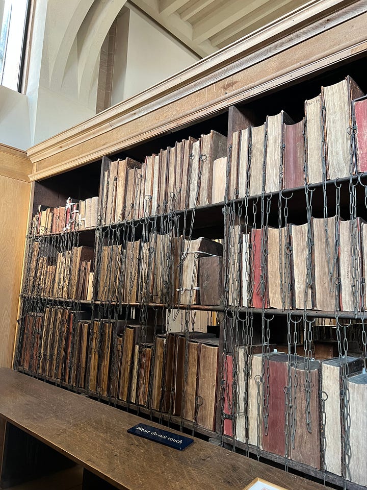 Last week I had the opportunity to visit a chained library. In the Hereford Cathedral. In Hereford, England. This unique and fascinating library holds books and manuscripts that date back to the 8th century.